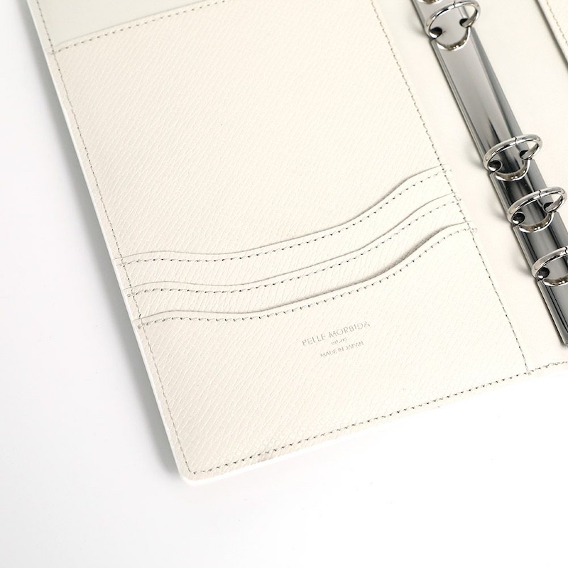内側には、カードや名刺が入るポケットや領収書や大切なメモを挟める仕切りを完備。